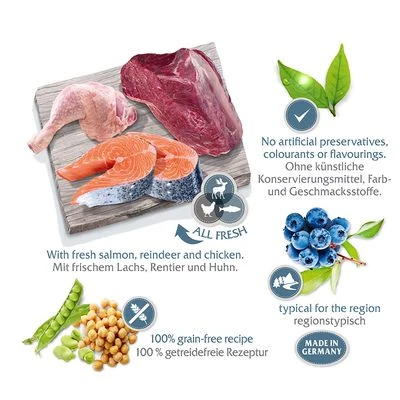 Da er dort in freier Wildbahn nur wenig Kohlenhydrate zu sich nimmt, haben auch wir in unserem Futter kein Getreide eingesetzt. Unsere Rezepturen bestehen aus viel regionstypischem Frischfleisch und werden durch Wurzeln, Wildkräuter und regionstypische Beeren ergänzt. Als wertvolle pflanzliche Proteinquelle werden ausschließlich Erbsen, Ackerbohnen und Kichererbsen verwendet.