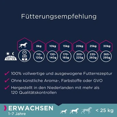 - Vollwertiges Trockenfutter für ausgewachsene Hunde kleiner und mittelgroßer Rassen (< 25 kg)