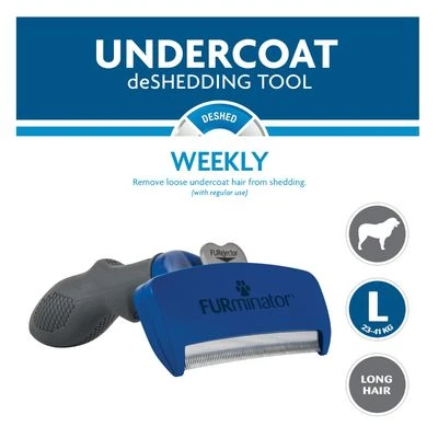 Die Fellpflege von Hunden – insbesondere von großen Hunden mit langem Haar – kann sich mitunter ganz schön aufwendig gestalten. Umso wichtiger ist geeignetes Zubehör. Das FURminator deShedding Tool L Langhaar erleichtert die Entfernung der Unterwolle, also bereits abgestoßener Haare, und ist speziell für große, langhaarige Hunde ausgelegt.