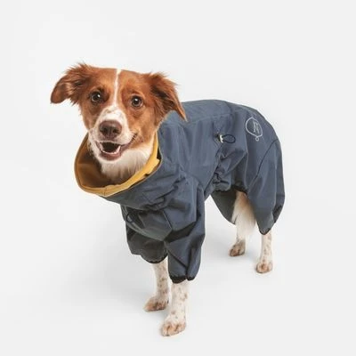Der hohe, weiche Kragen, der mit Knöpfen an der Innenseite des Mantels befestigt ist, sorgt für zusätzlichen Schutz und Komfort. Für Sicherheit bei Dunkelheit sorgen reflektierende Prints. Ein versteckter Reißverschluss im Rückenbereich ermöglicht das Durchführen einer Hundeleine. An den Bündchen sowie an der Taille und am Kragen kann der Nomad Tales Spirit Hundeoverall Atlantic individuell an die Körperform deines Hundes angepasst werden.