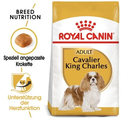 Durch sein munteres, fröhliches und anpassungsfähiges Wesen ist der Cavalier King Charles Spaniel ein beliebter und folgsamer Begleiter. Er hat ein langes, seidiges und weiches Fell, dessen natürliche Pigmentierung hervorgehoben werden sollte. Seiner Größe entsprechend besitzt der King Charles Spaniel einen kleinen Kiefer mit engstehenden Zähnen, die besonderer Pflege bedürfen. Royal Canin Cavalier King Charles Adult für erwachsene Hunde ab 10 Monate berücksichtigt alle wesentlichen spezifischen Merkmale. Alle Royal Canin Produkte durchlaufen eine umfassende Qualitätskontrolle, um eine optimale Futterqualität zu gewährleisten. Nahrungen der Breed Health Nutrition Range zeichnen sich durch hochwertige Proteine und ein ausgewogenes Nährstoffprofil aus. Darüber hinaus sind die Trockenfutterkroketten in Größe, Form und Textur auf die jeweilige Hunderasse abgestimmt.