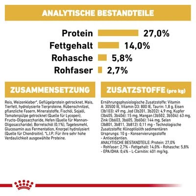- Spezielle Rezeptur für Idealgewicht: neben ausreichend Bewegung muss die aufgenommene Energie kontrolliert werden, niedriger Fettgehalt von 14%, L-Carnitin kann die körpereigenen Fettreserven mobilisieren