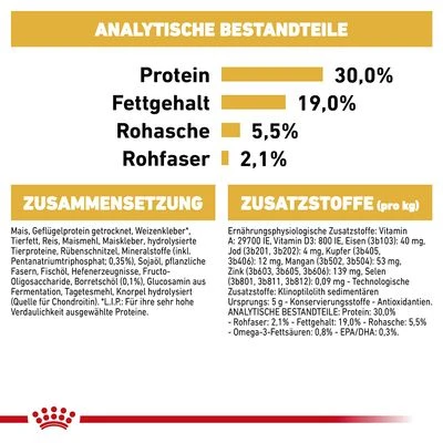 - Fellgesundheit: angepasster Proteingehalt, Borretschöl und Omega-3-Fettsäuren können kontinuierliches Haarwachstum sowe glänzendes Fell fördern