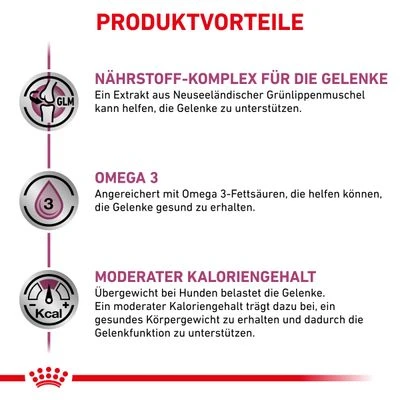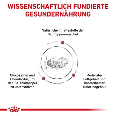 Das Trockenfutter ist mit einem moderaten Energiegehalt versehen, um die Haltung des Idealgewichts zu fördern. So kann das Risiko für Übergewicht reduziert werden, um die Gelenke zu entlasten. Weiterhin ist Neuseeländische Grünlippmuschel enthalten, die unter anderem Glucosamin als natürlichen Bestandteil der Gelenke enthält. Wertvolle Omega-3-Fettsäuren können zusätzlich zur normalen Gelenkfunktion beitragen.