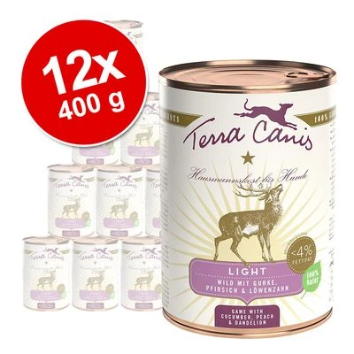 Das getreidefreie Terra Canis Light Hundefutter ist ein kalorienreduziertes Alleinfutter, mit maximal 4% Fett, für übergewichtige Hunde, jetzt im Sparpaket 12 x 400 g
