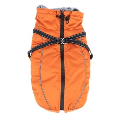 Knalliger Wintermantel für Hunde, mit integriertem Geschirr, wasserfest, mit warmem Fleece-Futter & hohem Kragen aus Fell-Imitat, verstellbarer Brustgurt & Kordelzüge an Hals & Rücken, Farbe: orange