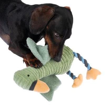 Niedliches Spielzeug für mittelgroße bis große Hunde, quietscht und knistert, Beine aus zahnschonendem Tau zum Kauen, ideal zum Schütteln, werfen und holen, weich gefüllt, aus Polyester & Baumwolle